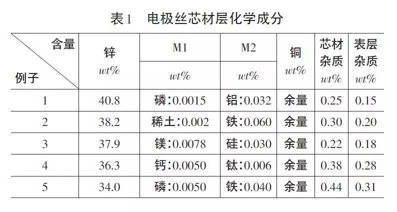 (2)新型耐蝕電極絲芯材層的添加元素由兩部分組成,分別為M1和M2,其中M1為磷、稀土、鈉、鉀、鎂、鈣中的至少一種,M2為鋁、硅、錳、鈦、鉻、鐵中的至少一種。其中M1的含量為0.0005~0.05wt%,M2的含量為0.005~0.08wt%。且表層金屬層中有M1和M2中的各至少一種。