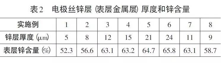 (6)成品加工:本工序采用退火+塑性加工+退火的在線技術(shù),根據(jù)加工階段的不同工藝參數(shù)組合,將電極絲性能調(diào)整到材料所要求的導(dǎo)電性能與力學(xué)性能及如表2所示的表層鋅含量。