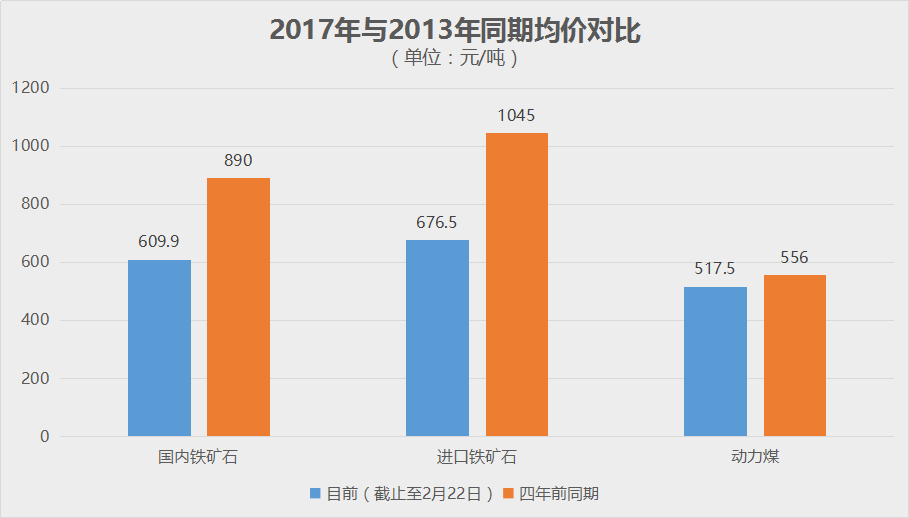 可以看出,盡管在2016年年底,煤炭價格經過一輪瘋狂上漲,但由于此前跌幅過大,目前價格并未恢復到當初的水平。而原本漲幅居后的國內鋼價,在春節(jié)之后這一輪瘋狂拉漲之后,漲幅已經后來居上。